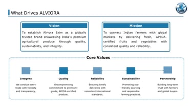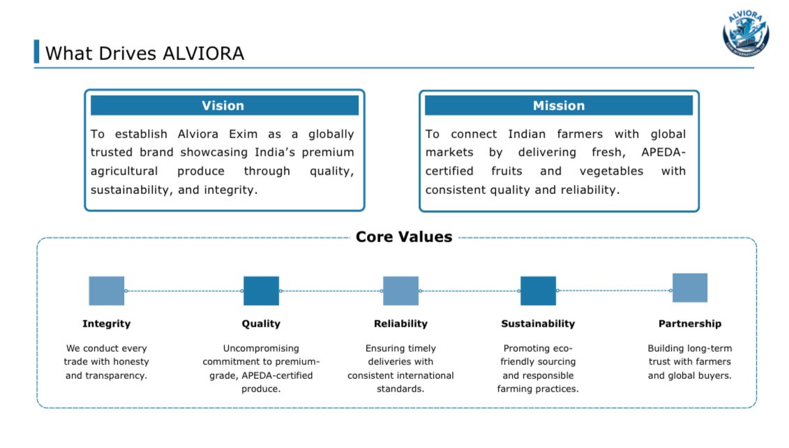 Alviora Exim International LLP is a APEDA-registered export company from India, dedicated to delivering premium-quality fruits and vegetables to international markets. Rooted in trust, transparency, and sustainability, we ensure farm-to-ship excellence through a robust network of certified growers and modern quality control practices. Our current focus lies in building strong trade relationships with Middle Eastern importers, offering them Indian produce known for its freshness, flavor, and reliability.